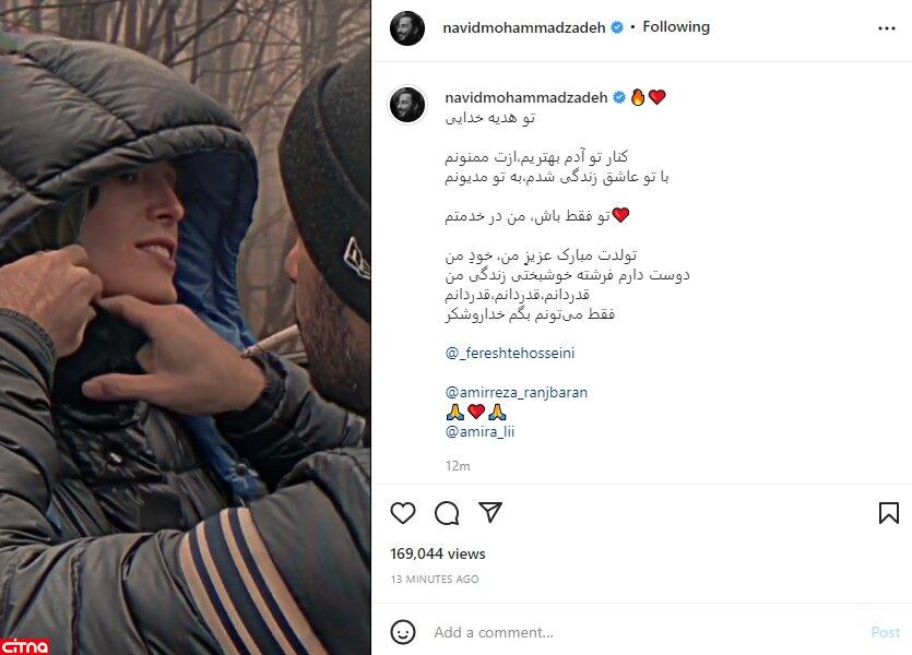 نوید محمدزاده با انتشار ویدئویی از خود در کنار همسرش، فرشته حسینی با متنی که با «تو هدیه خدایی» آغاز میشود، تولد او را تبریک گفت.