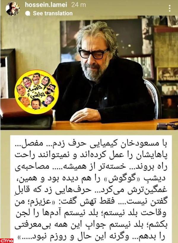 حسین لامعی، فعال رسانه ای با انتشار یک استوری از واکنش مسعود کیمیایی به مصاحبه فائقه آتشین (گوگوش) همسر سابق کیمیایی خبرداد.