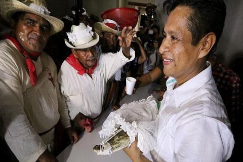شهرهای فقیرنشین در جنوب مکزیک همچنان مجددانه و سرسختانه بر آیینها و زبان خود تعصب دارند تمساح را لباس سفید عروسی بر تن میکنند و به او تزئینات میبندند.