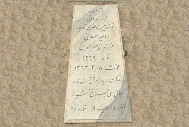 «آرامگاه شادروان بانو خدیجه ناصری قاجار (امیر اصلانی)، فرزند ناصرالدین تولد ۱۲۶۹، فوت ۱۳۶۳.۲.۸» و با این بیت: