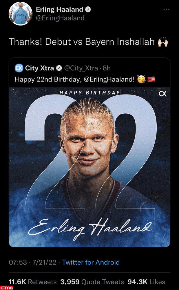 به گزارش سرویس وبگردی سیتنا، ارلینگ هالند با انتشار یک پست در توئیتر اعلام کرد اولین بازی خود با پیراهن منچسترسیتی را روز شنبه برابر بایرنمونیخ انجام خواهد داد.