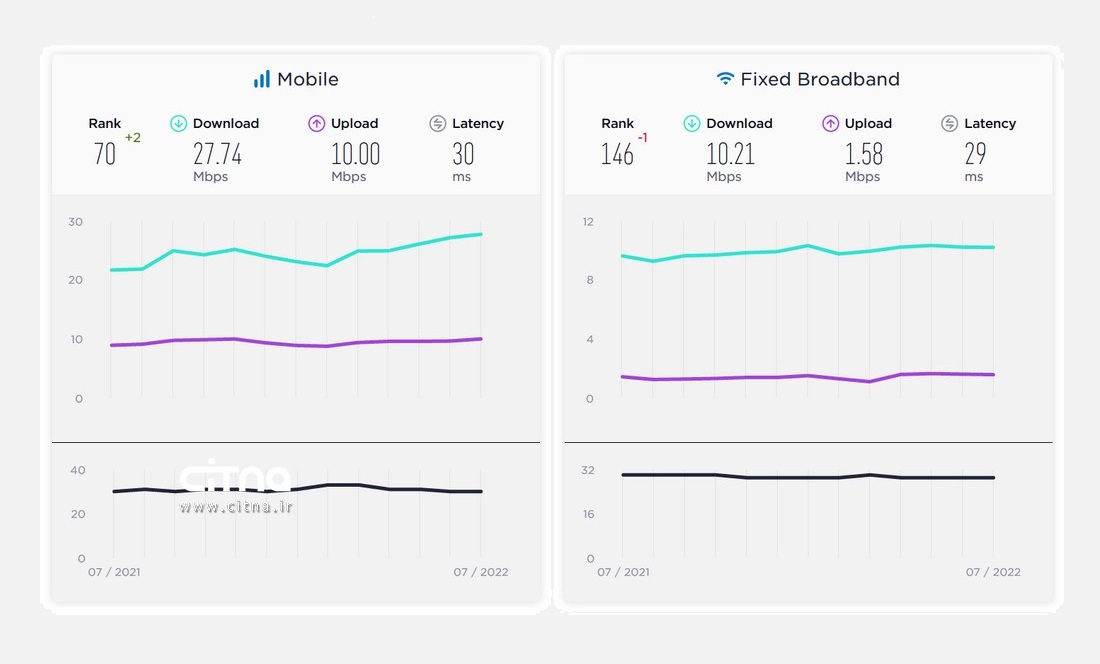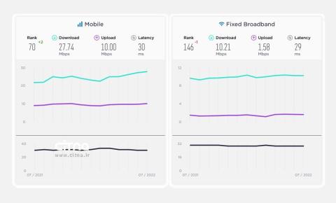 به استناد جدیدترین رتبهبندی سایت معتبر اسپیدتست، سرعت اینترنت موبایل در ایران در هفتمین ماه سال جاری میلادی (تا نیمه نخست مردادماه 1401) نسبت به ماه قبلتر از آن با دو پله صعود به 70 از میان 140 کشور بررسی شده رسیده، اما سرعت اینترنت ثابت در ایران در همین بازهی زمانی با یک پله سقوط به 146 از میان 182 کشور دنیا رسیده است.