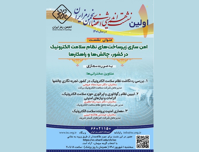 نخستین نشست هم اندیشی اعضای انجمن رمز ایران در سال ۱۴۰۱ با عنوان امن سازی زیرساختهای نظام سلامت الکترونیک در کشور، چالشها و راهکارها اول شهریور ماه سال جاری به صورت مجازی برگزار می شود.