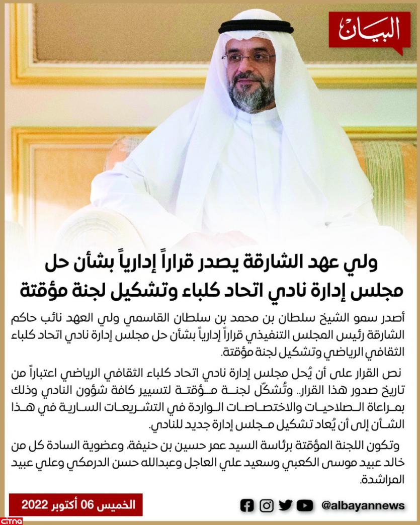 به گزارش سیتنا، روزنامه البیان امارات از تصمیم جدید ولیعهد و حاکم شارجه درخصوص هیئت مدیره باشگاه اتحاد کلباء خبر داد. تیمی که زیر نظر مالک این منطقه اداره می شود.