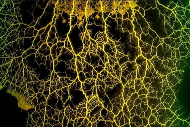 چیزی که میبینید شکل پلاسمودیوم از بلاب(با نام علمی Physarum polycephalum) ، یا کپک مخاطی چند سر است. این موجود همانند سایر کپکهای مخاطی موجود در طبیعت، نقش مهمی را در اکولوژی ایفا میکند و با تجزیه مواد آلی به بازگشت آنها به شبکه غذایی کمک میکند.