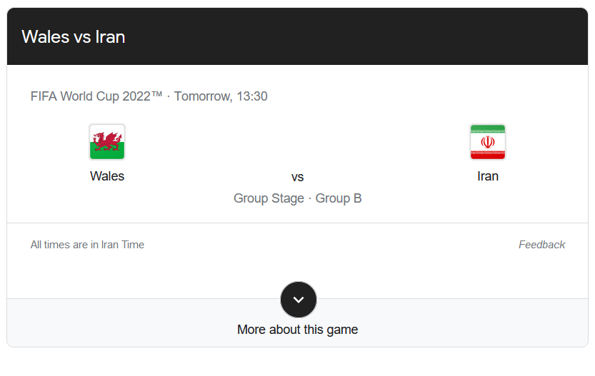 دومین بازی تیم ملی فوتبال ایران در جام جهانی ۲۰۲۲ قطر ساعت ۱۳:۳۰ روز جمعه ۴ آذرماه در ورزشگاه احمد بن علی مقابل ولز انجام میشود.