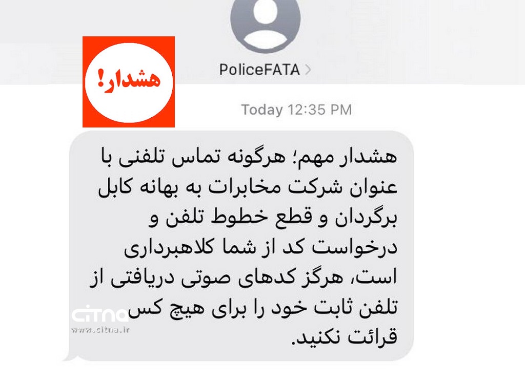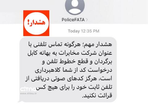هشدار مهم؛ هرگونه تماس تلفنی با عنوان شرکت مخابرات به بهانه کابل برگردان و قطع خطوط تلفن و درخواست کد از شما کلاهبرداری است، هرگز کدهای صوتی دریافتی از تلفن ثابت خود را برای هیچ کس قرائت نکنید.