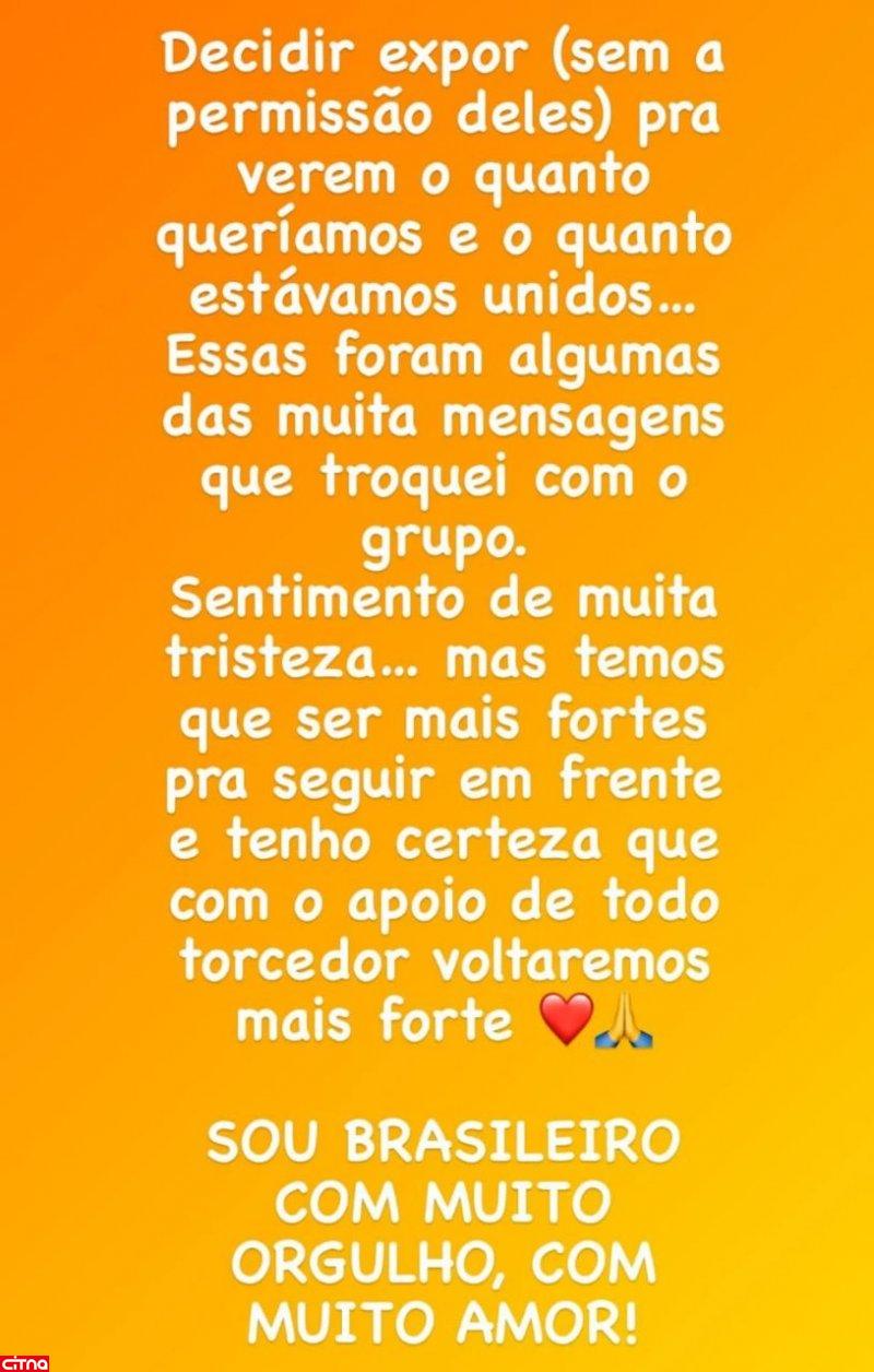 او ادامه داد: «این ها بخشی از پیام های زیادی بود که با تیم رد و بدل کردم. من خیلی ناراحتم... اما برای حرکت رو به جلو باید قوی تر باشیم و مطمئنم که با حمایت همه هواداران قوی تر برمی گردیم. من برزیلی هستم با غرور و عشق فراوان!»
