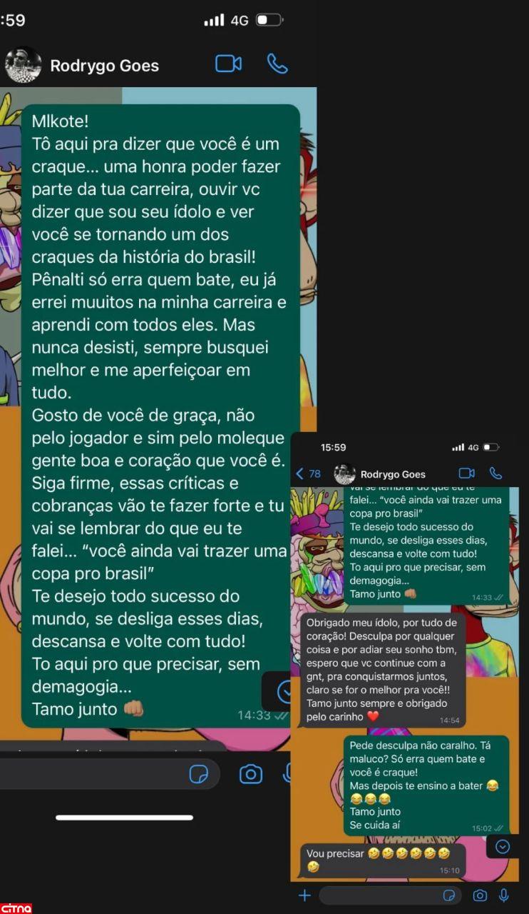 نیمار همچنین با این پیام از رودریگو حمایت کرده است: «من اینجا هستم تا بگویم تو یک ستاره هستی... باعث افتخار است که بخشی از دوران حرفه ای باشم. می خواستم بگویم که من الگوی تو هستم و خوشحالم که تو را به یکی از ستاره های تاریخ برزیل می بینم.»