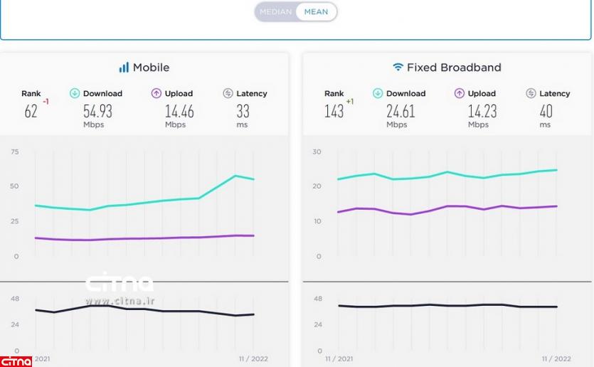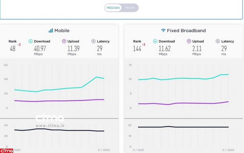 همچنین میانه سرعت اینترنت ثابت ایران در نوامبر 2022 میلادی ۱۱.۶۲ مگابیت برثانیه بوده و جایگاه آن در رده بندی جهانی با سه پله سقوط به ۱۴۴ نزول یافته است.