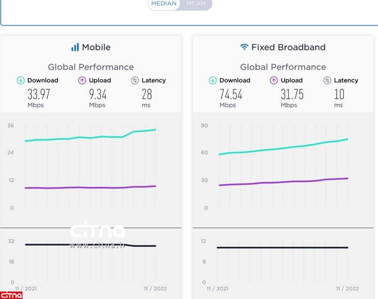 این در حالی است که در اکتبر ۲۰۲۲ میلادی میانه سرعت اینترنت موبایل جهان ۳۳.۴۳ مگابیت برثانیه و اینترنت ثابت جهان ۷۲.۴۰ مگابیت برثانیه بوده است.