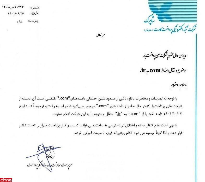 به گزارش سیتنا، شرکت شبکه الکترونیکی پرداخت کارت (شاپرک) در نامهای به شرکتهای پرداختیار اعلام کرد که با توجه به احتمال مسدود شدن دامنههای دات کام، پرداختیارها تا سوم دی سال جاری فرصت دارند سایت خود را به دامنه ir منتقل کرده و نتیجه را به شاپرک اعلام کنند.