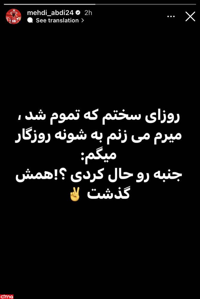 به گزارش سرویس وبگردی سیتنا، مهدی عبدی، مهاجم پرسپولیس که در این فصل نیمکتنشین شده یک استوری معنادار منتشر کرد.