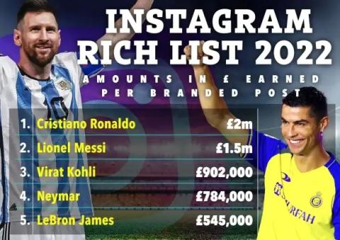 کریستیانو رونالدو در سال ۲۰۲۲ به ازای هر پست تبلیغاتی، ۲.۵ میلیون دلار به دست آورد که این رقم از مسی با ۱.۸ میلیون دلار و ویرات کوهلی بازیکن کریکت هند با یک میلیون دلار برای هر پست بالاتر است.
