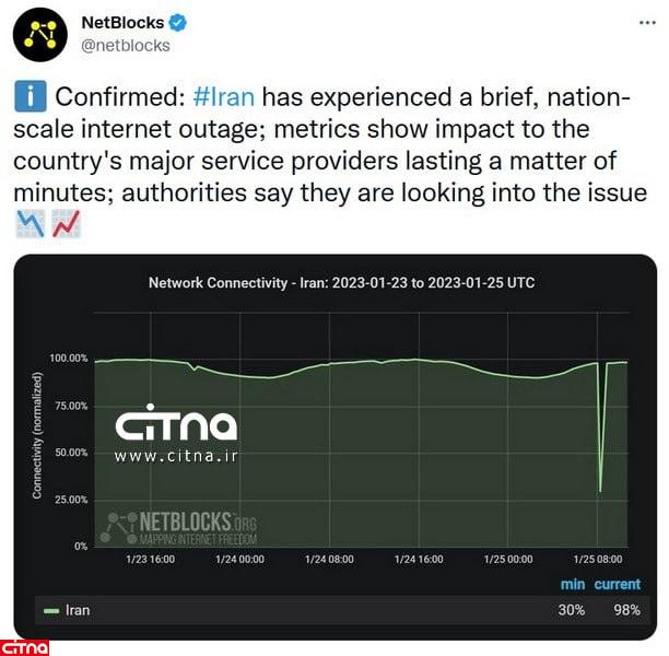 در همین حال، سایت ناظر بر ترافیک جهانی اینترنت یعنی نت بلاکس هم این قطعی سراسری اینترنت در ایران را تایید و در توئیتی آورد: «ایران یک قطع کوتاه اینترنت در مقیاس ملی را تجربه کرده است. معیارها تأثیری را بر ارائه دهندگان خدمات عمده کشور نشان می دهد که چند دقیقه به طول انجامید. مقامات می گویند که در حال بررسی این موضوع هستند».
