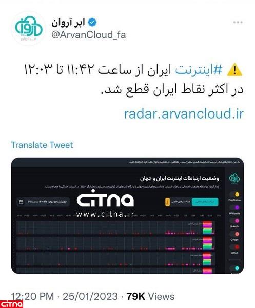البته ابر آروان مدت زمان قطعی را نزدیک به ۲۰ دقیقه اعلام کرده و در توئیتی نوشته است: اینترنت ایران از ساعت ۱۱:۴۲ تا ۱۲:۰۳ در اکثر نقاط ایران قطع شد.