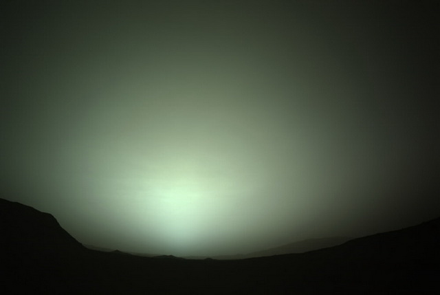 در این تصویر که در 29 ژانویه گرفته شده است، طلوع خورشید مریخی از پشت پوشش ابری پراکنده قابل مشاهده است. ابرها به دلیل کم بودن آب در جو مریخ بسیار نازک هستند. با توجه به بیانیه ناسا، اگر تمام آب موجود در جو مریخ روی سطح این سیاره باشد، لایهای نازکتر از یک رشته موی انسان تشکیل میشود.