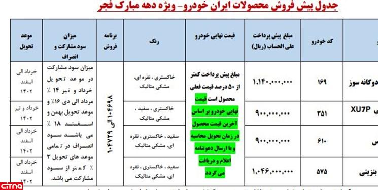 بر اساس این گزارش همچنین برندگان قرعهکشی که متقاضی رانا پلاس بودهاند باید مبلغ 90 میلیون تومان را به عنوان پیش پرداخت علی الحساب در حساب وکالتی و برندگان قرعهکشی متقاضی خرید سورن پلاس بنزینی نیز باید مبلغ یکصد و چهار میلیون و 600 هزار تومان را به عنوان پیش پرداخت علیالحساب در حساب وکالتی خود داشته باشند.