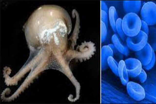 تفاوت دیگر اختاپوس با انسانها، رنگ خون آنهاست. خون اختاپوس به رنگ آبی است و دلیل آن این است که سیستم حمل اکسیژن در خون در بدن اختاپوسها و جانوران همخانواده آنها، با بهرهگیری از پروتئینهایی برپایه مس به نام هموسیانین انجام میشود و این اتفاق در بدن انسان توسط پروتئینهایی برپایه آهن، به نام هموگلوبین صورت میپذیرد.