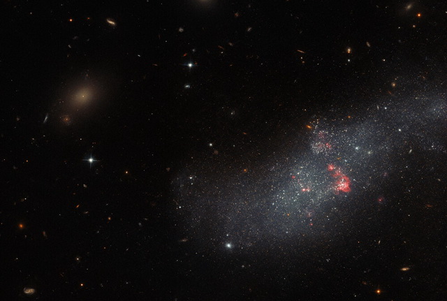 بااینحال ویژگیهای قابلمشاهدهای در این کهکشان وجود دارد؛ مانند مناطق قرمز درخشان که در آن ستارههای جدیدیدرحال شکلگیری هستند. وقتی ستارگان جوان هستند، تشعشعات فرابنفش ساطع میکنند که گاز مجاور آن را روشنمیکند و باعث میشود درخشان شود.