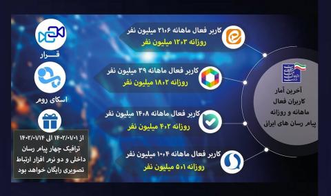 به گزارش سیتنا، محمد احسان خرامید، رئیس مرکز اطلاعرسانی و روابط عمومی وزارت ارتباطات و فناوری اطلاعات با انتشار جدیدترین آمار کاربران روزانه و ماهانه پیام رسان های ایرانی، تاکید کرد که از اول تا چهاردهم فروردین ترافیک چهار پیام رسان و دو نرم افزار ارتباط تصویری رایگان خواهد بود.