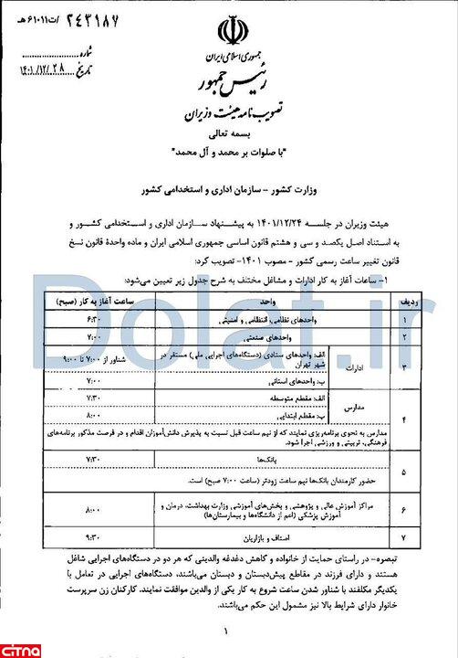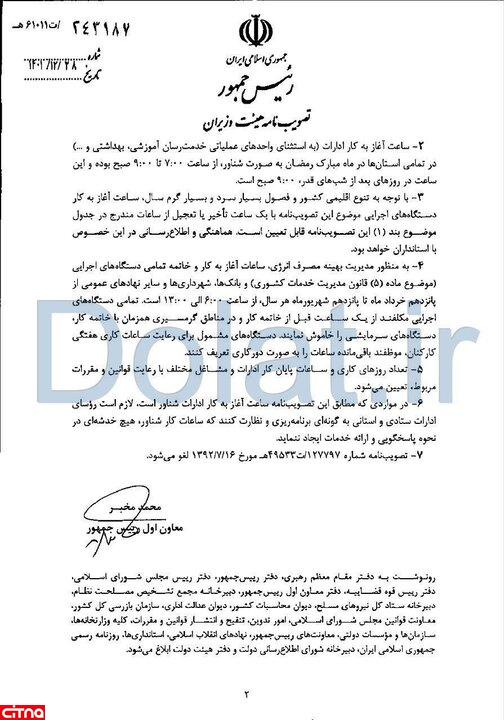 پایگاه اطلاع رسانی دولت جهت تنویر افکار عمومی و اجتناب از برداشتهای خلاف واقع، تصویر مصوبه ساعت به کار ادارات و مشاغل را منتشر کرد.