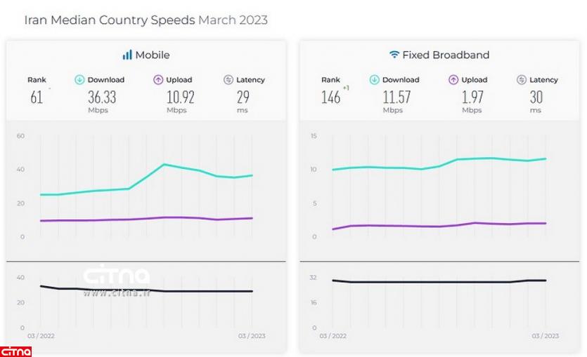 جدیدترین دادههای سایت اسپیدتست نشان میدهد که در آمار مربوط به ماه مارس سال 2023 (اسفند 1401- فروردین 1402) میانه سرعت اینترنت سیار کشور در جایگاه 61 ثابت مانده و سرعت اینترنت ثابت هم با یک پله صعود به رتبه 146 در بین کشورهای دنیا رسیده است.
