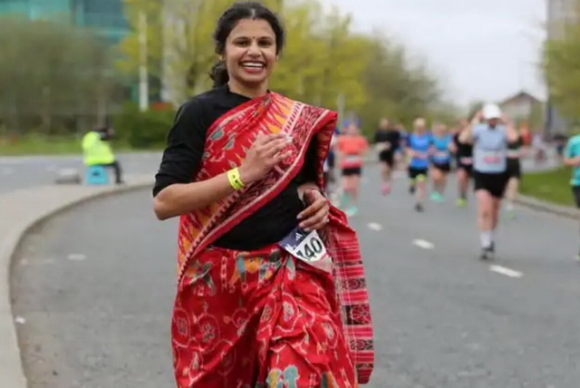 به گزارش سیتنا، زنی اهل اودیسای هند که در بریتانیا زندگی میکند، تصمیم گرفت با لباس سنتی زادگاه خود، ساری سامبالپوری (Sambalpuri) دستبافت هندی در دوی ماراتون شرکت کند.