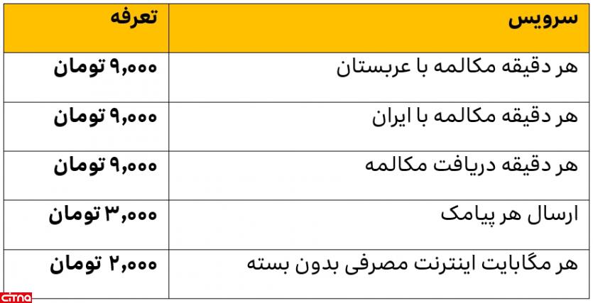 همچنین هزینه هر دقیقه تماس داخلی در کشور عربستان، هر دقیقه تماس با ایران و نیز هر دقیقه تماس دریافتی در کشور عربستان، ۹۰۰۰ تومان خواهد بود. هزینه ارسال هر پیامک، ۳۰۰۰ تومان و هزینه هر مگابایت اینترنت همراه مصرفی بدون فعالسازی بسته نیز ۲۰۰۰ تومان است.