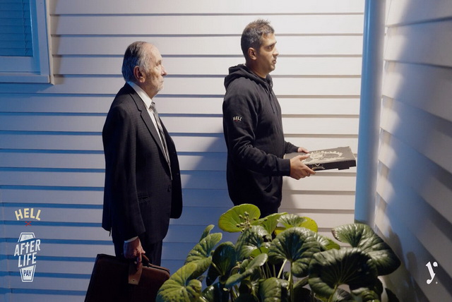 موقع تحویل پیتزا به مشتریانی که آنقدر خوششانس بوده و توانستهاند در این طرح ثبتنام کنند، وکیلی با تحویلدهنده پیتزا به درب منزل مشتری رفته و با او قرارداد رسمی «پرداخت پس از مرگ» را می بندد.