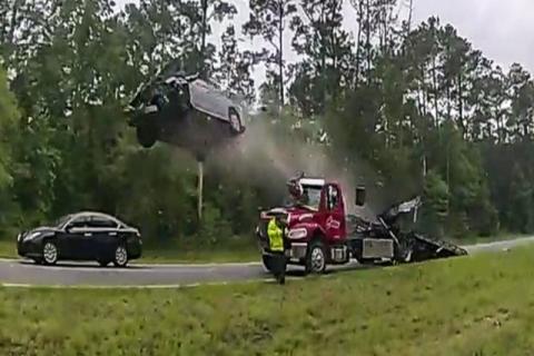 به گزارش سیتنا، پلیس بزرگراهی در جورجیا با صحنهای مواجه شد که نظیر آن را فقط در صحنههای فیلمهای ماجراجویی دیده بود. در این بزرگراه چند خودرو با هم تصادف کرده بودند و پلیس با آوردن کامیون یدککش، مشغول جمع کردن خودروهای تصادفی از بزرگراه بود. اما وقتی کامیون، سطح شیبدار خود را پایین آورده بود، ناگهان رانندهای دیگر سوار بر خودروی سدان، با سرعت ۱۰۰ کیلومتر در ساعت به کامیون نزدیک شد و از روی سطح شیبدار عبور و تا ۳۶/۵ متر به هوا پرتاب شد و در نهایت به روی جاده سقوط کرد.