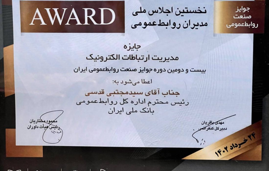 به گزارش سیتنا به نقل از روابط عمومی بانک ملی ایران، روابط عمومی این بانک توانست در بخش «مدیریت ارتباطات الکترونیک» جایزه این بخش را به خود اختصاص دهد.