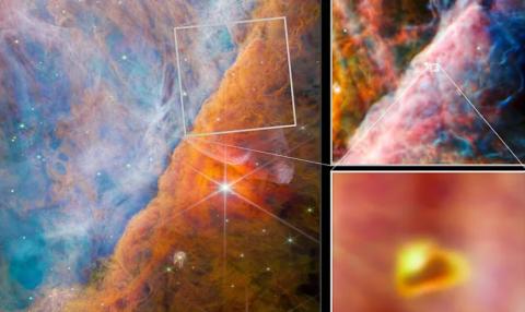تصاویر گرفته شده توسط تلسکوپ وب بخشی از سحابی شکارچی را نشان میدهد که به عنوان «نوار شکارچی» شناخته میشود، جایی که نور پرانرژی فرابنفش با ابرهای متراکم مولکولی در تعامل است و باعث تاثیر عمیق در مولکولها و مواد شیمیایی موجود در قرصهای پیشسیارهای میشود.