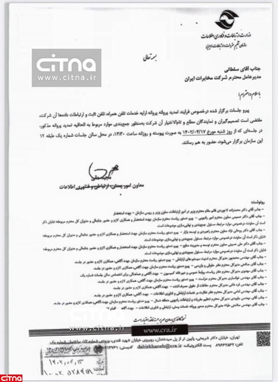 در نامهای به امضاء معاون امور پستی، ارتباطی و فنآوری سازمان تنظیم مقررات خطاب به مدیرعامل شرکت مخابرات ایران درخواست شده است که مدیرعامل شرکت مخابرات نسبت به معرفی نماینده تام الاختیار جهت حضور در جلسات «الحاقیه تمدید پروانه» از تاریخ شنبه 1402/04/17 به صورت پیوسته و روزانه اقدام نماید.