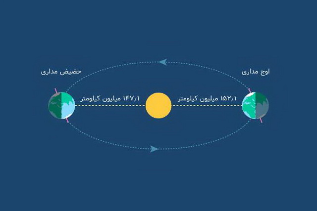 مکان نامتوازن ستارهی ما در مدار بیضوی زمین، بهاین معنی است که درطول یک سال سیارهی ما بهطور متناوب کمی به خورشید نزدیکتر و سپس دوباره از آن دورتر میشود. وقتی زمین در نزدیکترین فاصله به خورشید قرار دارد، میگوییم در نقطهی حضیض خورشیدی (Perihelion) قرار دارد. دورترین فاصله از خورشید نیز نقطهی اوج مداری (Aphelion) نامیده میشود.
