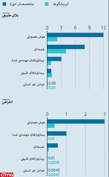 این شکاف گسترده، جزئیات جالبی را در خود پنهان کرده است. درهنگام تشخیص خطرات ناشی از هوش مصنوعی دو گروه بیشترین تفاوت نظر را داشتند. پیشبینیکنندگان بهطور متوسط تخمین زدند که تا پایان قرن، احتمال وقوع فاجعهای ناشی از هوش مصنوعی ۲٫۱ درصد و احتمال انقراض ناشی از هوش مصنوعی، ۰/۳۸ درصد است. در مقابل، متخصصان حوزهی هوش مصنوعی، بهترتیب احتمال ۱۲ و ۳ درصد را به این دو واقعه اختصاص دادند. وقتی نوبت به دنیاگیریها رسید، ابرپیشبینیکنندگان درمقایسه با متخصصان حوزه نسبتبه خطرات ناشی از بیماریهای طبیعی بدبین بودند.