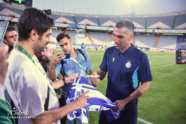 در همین لحظه یکی از هوادارانی که در کنار هاشمینسب قرار داشت از وی خواست تا خاطرهای از آن بازی را تعریف کند و مربی استقلال پیراهن را امضا کرد و در حال تحویل دادن پیراهن گفت: ولش کن ...هنوز هیچی نشده داریم حاشیه درست میکنیم.