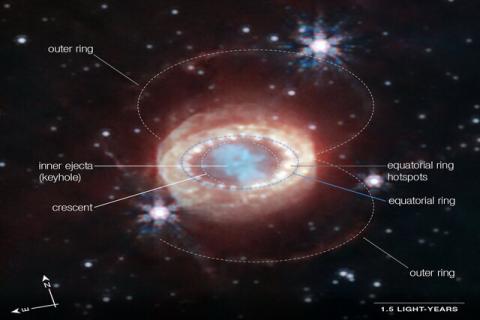 یک حلقه روشن، سوراخ کلید داخلی را احاطه کرده و نواری را در اطراف آن تشکیل داده است که دو بازوی ضعیف حلقههای بیرونی به شکل ساعت شنی را به هم متصل میکند. حلقه از موادی که دهها هزار سال پیش در اثر انفجار ابرنواختر به بیرون پرتاب شدهاند، تشکیل شده و حاوی نقاط داغ درخشانی است که با برخورد موج ضربهای ابرنواختر به شکل حلقه ظاهر میشوند. در حال حاضر لکههایی حتی در بیرون از حلقه دیده میشوند که با انتشارات پراکنده اطراف آن همراه هستند و مکانهایی را نشان میدهند که ابرنواختر در آنها به مواد بیرونی بیشتری برخورد میکند.