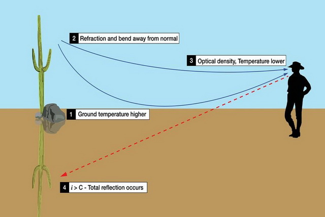 باز هم، چون چشم پیش بینی می کند که نور در یک خط مستقیم حرکت کند، تصویر را پایین تر و وارونه تفسیر می کند. اینگونه است که تصویری از آسمان می تواند مانند سطح آب در کف بیابان ظاهر شود.