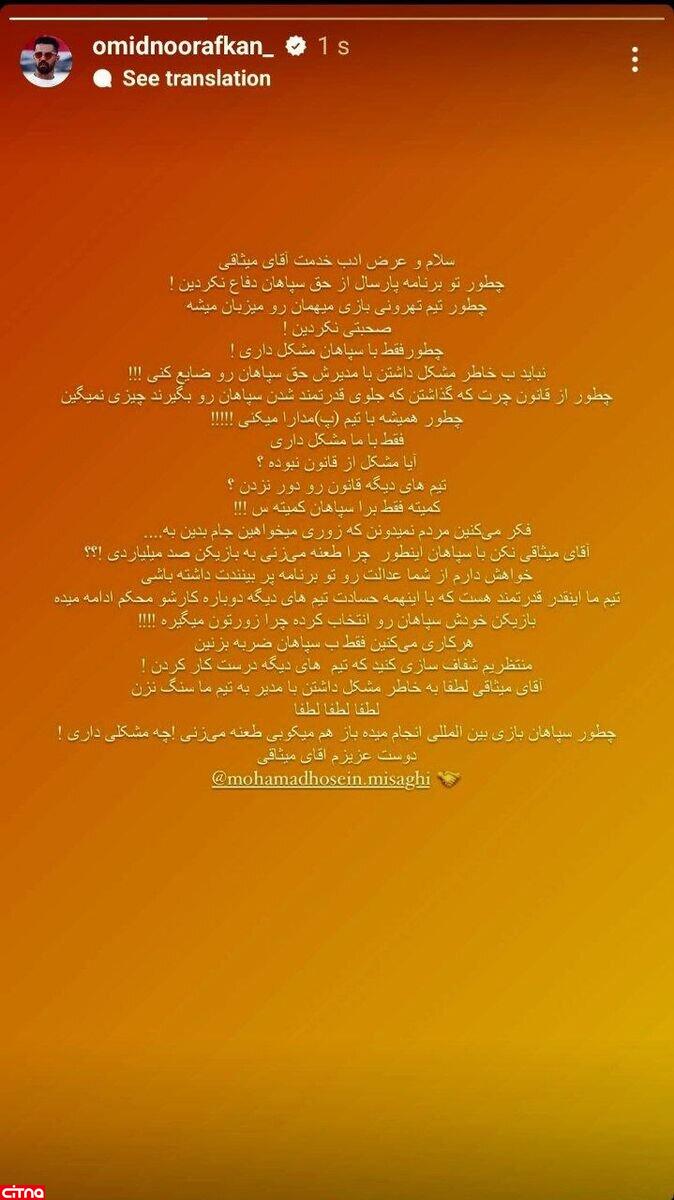 امید استوری خود را خطاب به میثاقی، اینطور شروع کرد: سلام و عرض ادب خدمت آقای میثاقی، چطور تو برنامه پارسال از حق سپاهان دفاع نکردین!