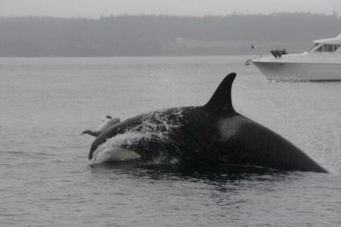 از سوی دیگر رفتار تهاجمی اورکاها میتواند نشانگر تمرین شکار باشد که به موجب آن اورکاها مهارتهای گروهی خود برای شکار ماهی سالمون را تقویت میکنند.