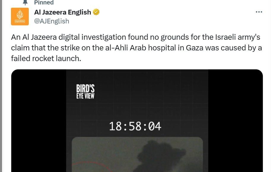 شبکه الجزیره به نقل از تیم تحقیق دیجیتال خود اعلام کرد که بررسیهای این تیم که ثانیه به ثانیه رخدادهای غزه را بررسی کرده به وضوح نشان میدهد که اسرائیل چهار بار در بازه زمانی منتهی به انفجار حوالی بیمارستان المعمدانی را هدف قرار داده است که یکی از آنها موجب فاجعه کشتار شده است.