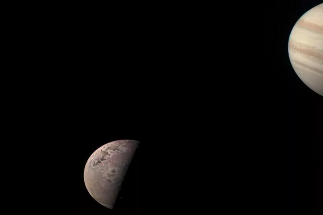 به علاوه، فضاپیمای جونو تصاویری از سطح آتشین قمر آیو تهیه کرده است که صدها آتشفشان و میدانهای جاری گدازه را نشان میدهد. این ماهواره در حقیقت دو ستون دود آتشفشانی فعال را نیز ثبت کرده.