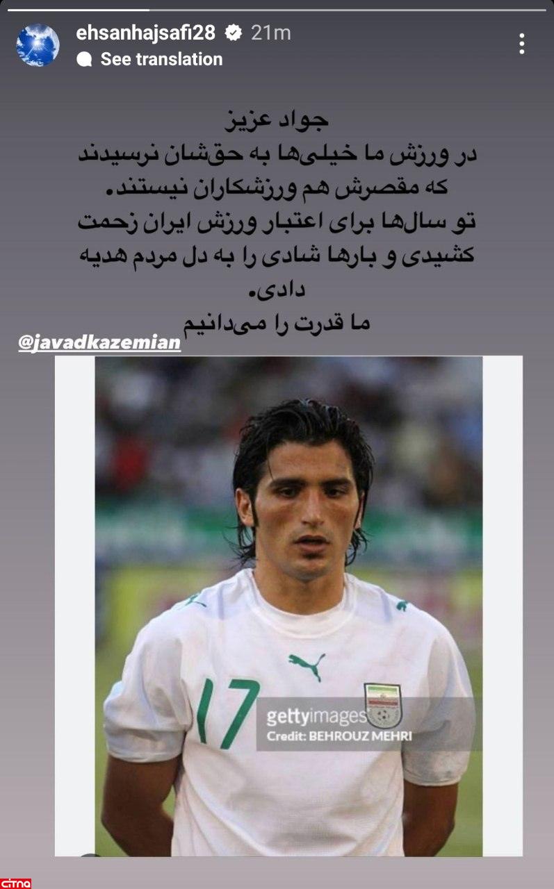 به گزارش سرویس وبگردی سیتنا، احسان حاج صفی با انتشار یک استوری در جنگ بین کشتی گیران و فوتبالیست های ایرانی به حمایت از جواد کاظمیان پرداخت. استوری حاج صفی را مشاهده می کنید: