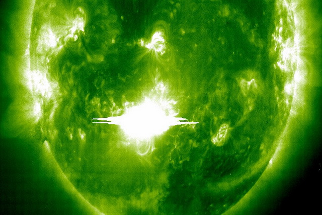فضاپیمای رصدخانه ناسا(SOHO) این تصویر را از یک شعله عظیم خورشیدی کلاس X هنگام فوران از خورشید در 28 اکتبر 2003 گرفته است.