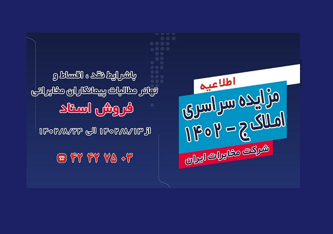 ج -۱۴۰۲، به اطلاع عموم مشتریان و ذی نغعان می رساند ”مزایده ج -۱۴۰۲ ، فروش املاک مازاد شرکت مخابرات ” با هدف تامین نقدینگی برای تعهد بودجه غیر عملیاتی، مطالبات بازنشستگان، طرح نجما و توسعه شبکه مناطق مخابراتی در سراسر کشور برگزار می شود.