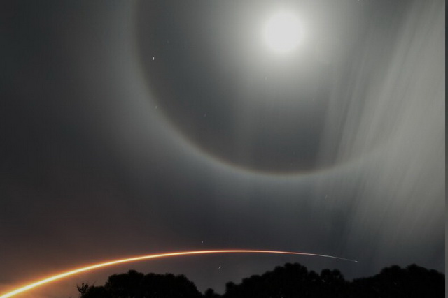 اندکی بعد از پرتاب موشک فالکون ۹ اسپیس ایکس از فلوریدا، این موشک از میان ابرهای کریستالی یخی عبور کرد و موقتا هالهای از نور ایجاد کرد که به نظر میرسید این هاله کاملا ماه را در برگرفته است.