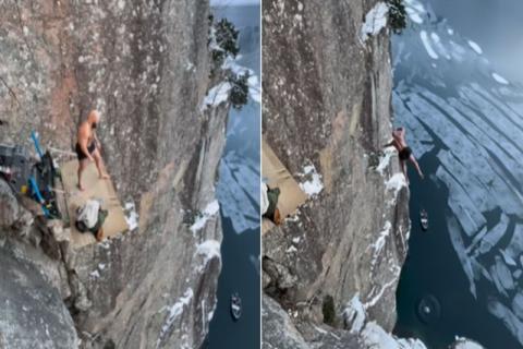 «شیرجه مرگبار» از ارتفاع ۴۰ متری درون آب یخ