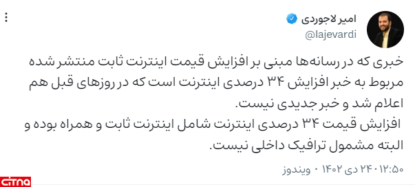 خبری که در رسانهها مبنی بر افزایش قیمت اینترنت ثابت منتشر شده مربوط به خبر افزایش ۳۴ درصدی اینترنت است که در روزهای قبل هم اعلام شد و خبر جدیدی نیست. افزایش قیمت ۳۴ درصدی اینترنت شامل اینترنت ثابت و همراه بوده و البته مشمول ترافیک داخلی نیست.