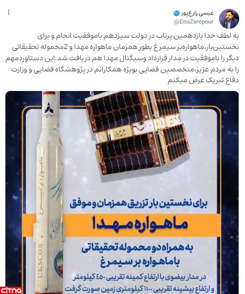 وزیر ارتباطات و فناوری اطلاعات گفت: یازدهمین پرتاب در دولت سیزدهم با موفقیت انجام و برای نخستینبار، ماهوارهبر سیمرغ به طور همزمان ماهواره مهدا و دو محموله تحقیقاتی دیگر را باموفقیت در مدار قرار داد و سیگنال مهدا هم دریافت شد.